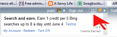 Are you getting paid to surf the internet? Bing.com (Microsoft's answer to Goggle) is offering 250 points just for siging up! Then get another 1 point for every 5 searches. (up to 8 per day until 6/4). Search everyday from now until then and you'll have 338 points!