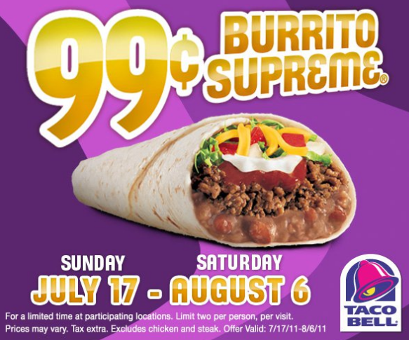 Beginning tomorrow July 17th through August 16th you can score Burrito Supremes at Taco Bell for just $.99. NO coupon is needed.