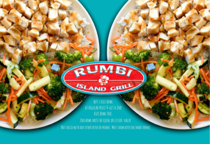 Here is a sweet deal from Rumbi Island Grill. From today until July 22nd buy a Chicken Rice Bowl or a Delicious Fresh Salad and get the second one FREE! You can also mix and match! Just show this Facebook post on your smartphone.