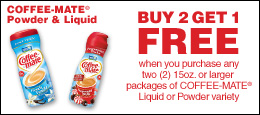 Coffee Mate Printable Coupons April 2, 2010JoaniContent may be sponsored or contain affiliate links. View full disclosure. Save .75/1 here Buy 1, Get 1 Stick pack here Buy 2 15oz. or larger, get 1 FREE here ShareTweetPinShareShareTweetPinShare