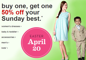 Target is hosting an Easter Dress promotion. Buy 1, Get 1 50% off promotion on all Easter Dress. The sale applies Easter Dresses, Men's Suits, Kids Easter Clothing and accessories.
