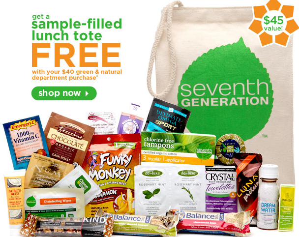 Through May 4th, Drugstore.com is offering a FREE Seventh Generation lunch-tote filled with 20 FREE samples with purchase of $40 or more participating items from their Green & Natural department!