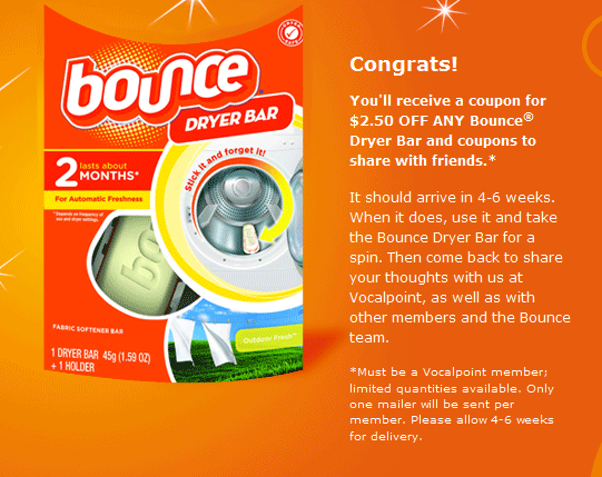 “You’ll receive a coupon for $2.50 OFF ANY Bounce Dryer Bar and coupons to share with friends.