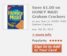 Honey Maid Graham Crackers Coupon: $1 off ONE! September 16, 2012JoaniLeave a CommentContent may be sponsored or contain affiliate links. View full disclosure. There's a high value $1/1 Honey Maid Graham Crackers coupon on Smith's website right now. Load it asap, the high value coupons usually don't last. ShareTweetPinShareShareTweetPinShare