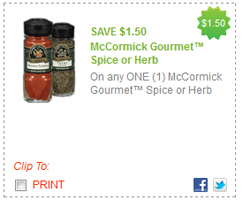 WOW! Enter zip code 84123 (if needed) at Redplum and gain access to a printable coupon for $1.50 off ONE McCormick Gourmet Spice or Herb.