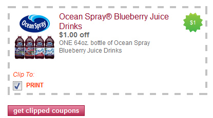 Go here to a grab a coupon for $1.00/1 Ocean Spray Blueberry Juice drink. (I was only able to print 1)