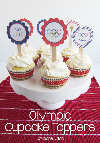 - Start by making a batch of your favorite cupcakes. While they cool, print these ADORABLE Olympic cupcake toppers over at Mirabelle Creations. 2. I like to print out cupcake toppers on cardstock or photo paper 3. Cut out the toppers with a 2″ punch or with scissors. 4. Tape craft sticks or sucker sticks on the back of the toppers. Insert into frosted cupcakes.