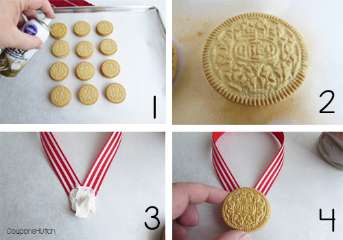 - Spray Golden Oreos with the Wilton Gold spray. 2. Let the cookies dry 5-10 minutes. 3. Cut 13″ lengths of red, white and blue ribbon. Attach the end of the ribbon to the other end of the ribbon with canned vanilla frosting. 4. Attach cookie to ribbon with a dab of frosting.