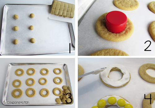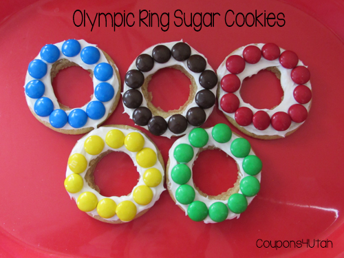 1. Bake a batch of sugar cookies, using refrigerated cookie dough. 2. When the cookies are almost cool, cut a hole in each cookie to make a ring. (I didn't have a cookie cutter the right size, so I looked around the kitchen and found this lid from our maple syrup was just the right size!) 3. Let the cookie rings cool completely. 4. Frost with white, canned frosting and top with M&M's in the colors of the Olympic rings.