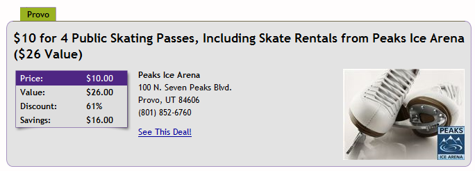 PROVO Deal: For a limited time and while supplies last you can pick up a family 4 pack of Skating passes valid at Peaks Ice Arena for $10 via C4Udeals.com. Also, Pass of all Pass holders can gain admission to Peaks Ice Arena during select times throughout the season. Typically the months are October and April.