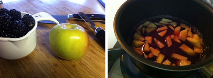 Combine 1/2 an apple, 1-2 tablespoons of sugar and 1/4 c Pomegranate juice in a small sauce pan and simmer until the apples are tender. Add 1 cup of Blackberries and cook until thick. It's delicious on ice cream, mixed into yogurt or on toast.