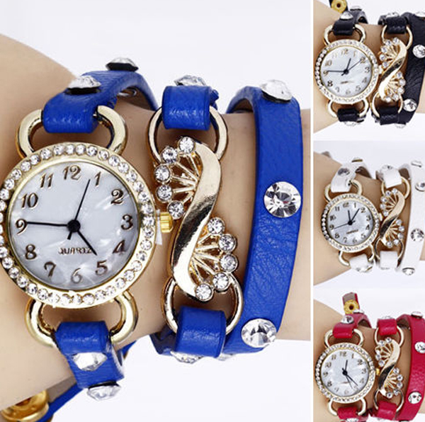 Here are even more cute watches on Ebay. Check out these Vogue Women Crystal Dial Layers Leather Bracelet Quartz Analog Wrist Watch (blue, red, white, black, brown), priced to sell for $2.80. Plus, shipping is free.